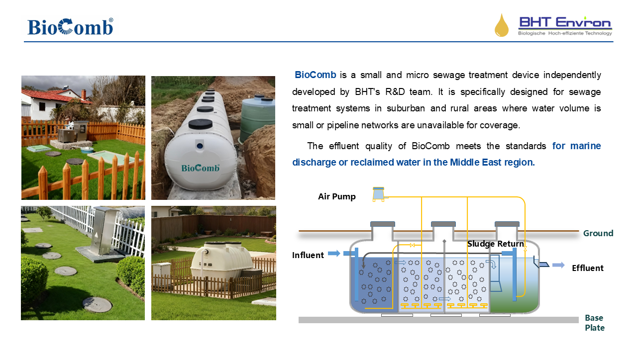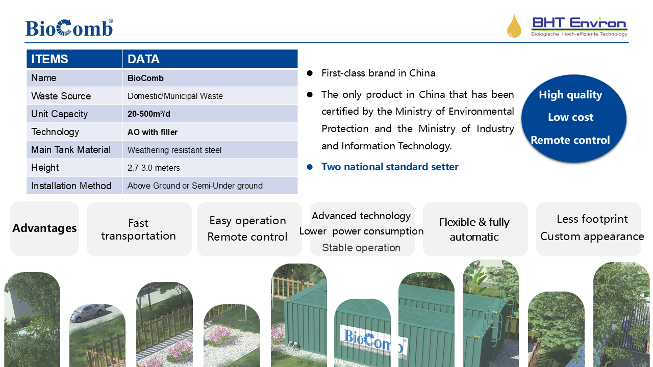 The BioComb integrated wastewater treatment equipment is available in two types: one is the containerized above-ground installation, which is suitable for large water treatment volumes; the other is the buried tank type, which is designed for relatively smaller water treatment volumes.