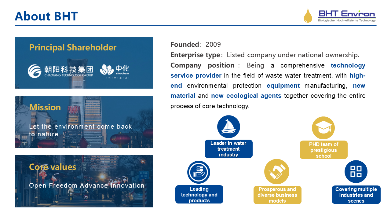 Beijing BHT Environmental Protection Technology Co., Ltd. was founded in 2009. Initiated by a team of professional PhDs, it is a national "little giant" enterprise known for its specialization, sophistication, uniqueness and innovation, as well as a high - tech enterprise. It is a well - known technology - based company of Sinochem in the water treatment field of the environmental protection sector, with the process package as its dominant business model. Based on its technological advantages in the biochemical field, BHT continuously explores and innovates, integrating the core - technology industrial chain throughout the whole process. It is committed to developing into a leading domestic and internationally renowned comprehensive technology service provider that integrates core process technologies, high - end environmental protection equipment manufacturing, new environmental protection materials, and new ecological agents.