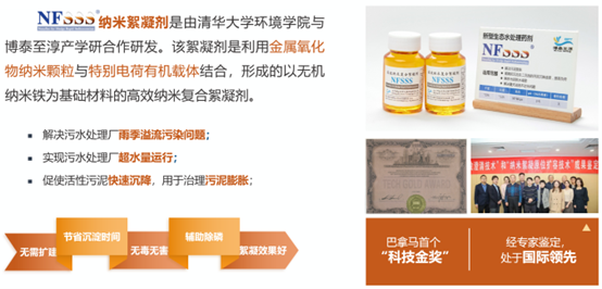 -NFSSS纳米絮凝剂:与清华大学环境学院产学研联合开发,缓解城市雨季溢流污染、超负荷达标运行及冬季污泥膨胀不达产问题的具有自主知识产权的技术,经技术鉴定,该技术已达到国际领先水平,并获得001号巴拿马科技金奖。不同于普通PAC与PAM,NFSSS纳米絮凝剂是在对活性污泥几乎没有影响的前提下实现泥水分离,其沉降速度几乎可以达到与「好氧颗粒污泥」相近的程度。