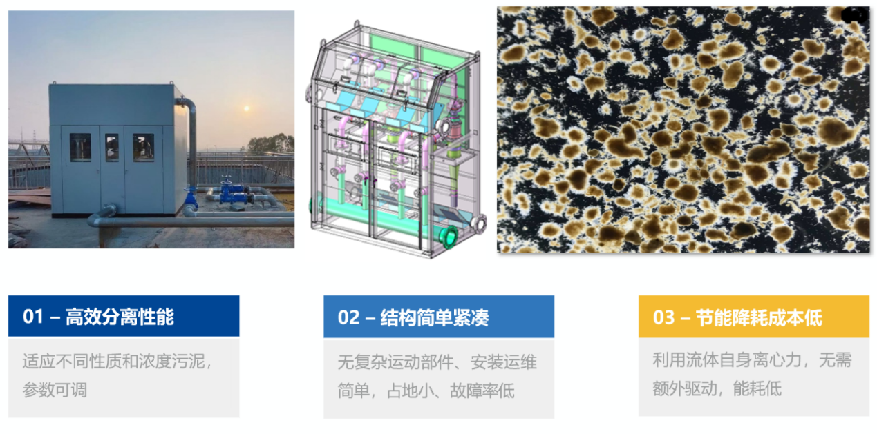 -SRD剩余污泥旋流分流系统:针对传统无差别排泥存在的有益微生物流失、脱氮除磷受损及污泥处置成本上升的问题提,SRD系统利用旋流离心原理,可以截留优质污泥回流、排出低活性污泥,保障污水处理效果和水质稳定性,大幅降低污泥体积,减少后续脱水设备的负荷和药剂投加量,是实现出水稳定化、污泥减量化的利器。