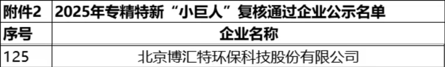 近日,北京市经济和信息化局公示专精特新小巨人企业复核结果,北京博汇特环保科技股份有限公司(以下简称 “博汇特”)顺利通过复核,延续北京市专精特新小巨人企业资质。