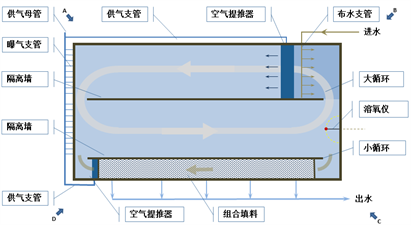第Ⅰ代BioDopp工艺针对一般工业污水,将传统氧化沟的混合液内回流理念和CASS工艺的前置微生物选择区优点,配合空气提推技术,实现大比倍回流,控制溶解氧浓度在0.3mg/L左右,奠定工艺高效低耗的基础。