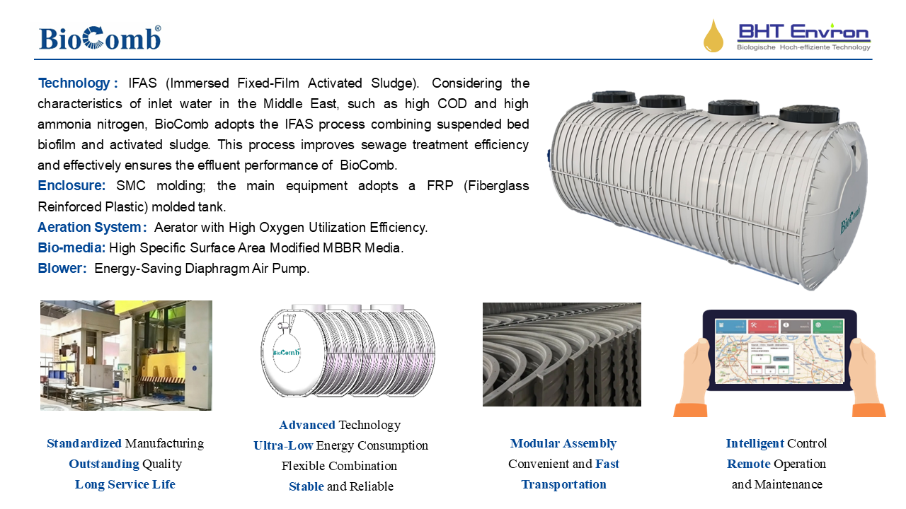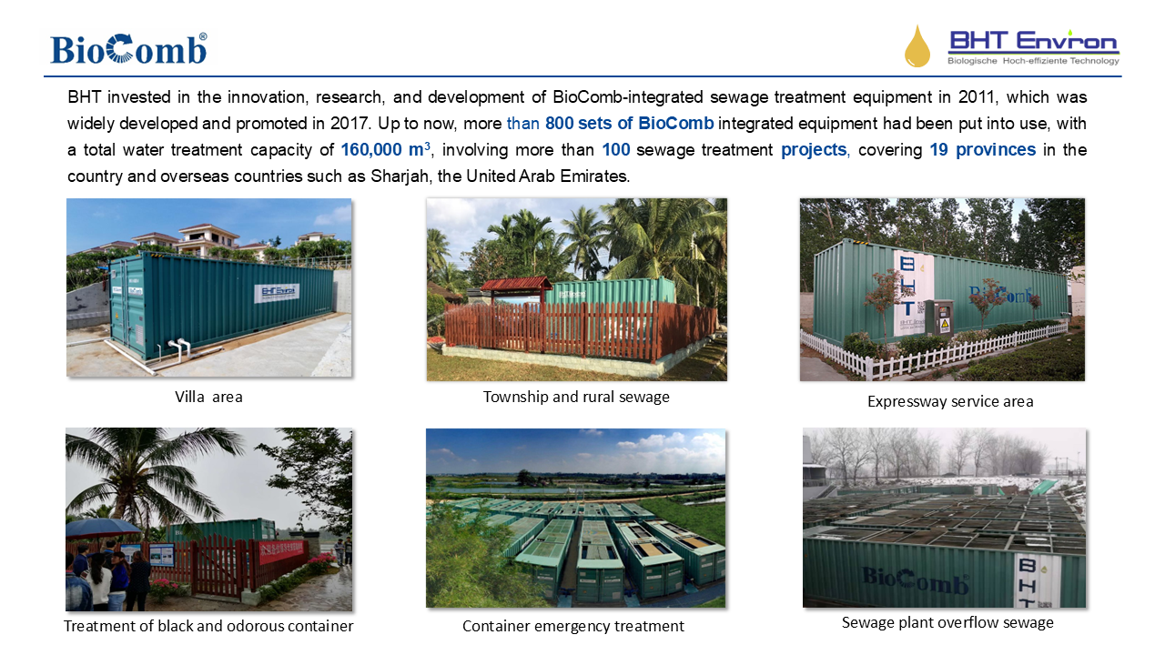 The BioComb integrated wastewater treatment equipment is available in two types: one is the containerized above-ground installation, which is suitable for large water treatment volumes; the other is the buried tank type, which is designed for relatively smaller water treatment volumes.