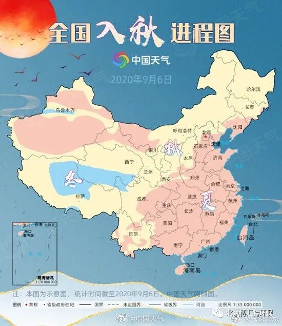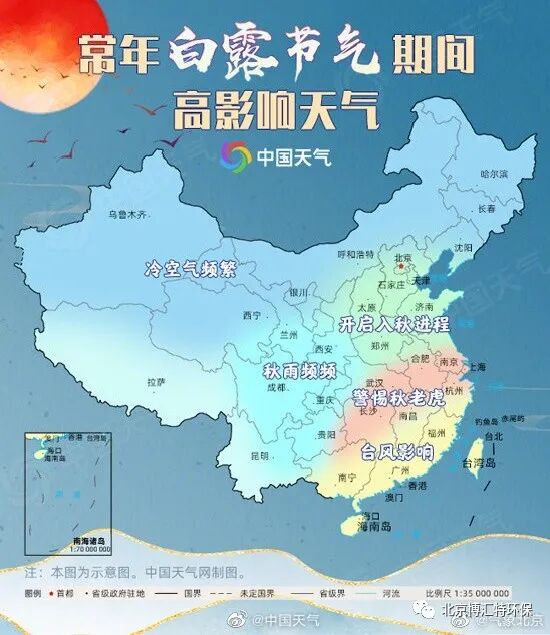 白露,是“二十四节气”中的第十五个节气,秋季第三个节气,干支历申月的结束与酉月的起始。斗指癸,太阳达黄经165度,于公历9月7-9日交节。古人以四时配五行,秋属金,金色白,故以白形容秋露。时至白露,基本结束了暑天的闷热,天气渐渐转凉,它是秋季中闷热转向凉爽的转折节点。进入白露节气后,夏季风逐步被冬季风所代替,冷空气分批南下,往往带来一定范围的降温幅度。