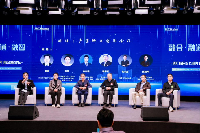 论坛特别设置了产学研与国际合作讨论环节,旨在促进学术界、产业界和研究机构之间的交流与合作。在主持人高嵩的带领下,清华大学环境学院教授、博士生导师左剑恶,北京科技大学环境系教授、博士生导师李子富,中国地质大学(北京)水资源与环境学院副院长、教授陈男,柏中环境副总裁张本龙以及博汇特首席运营官兼技术总监陈凯华就投融资策略、高校与企业的产学研协同、国际扩展路径等议题进行了深入的探讨。