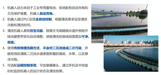 -二沉池自动清洗机器人:二沉池的稳定运行是保障出水水质的关键。二沉池自动清洗机器人无需停水,无需人员下池,安全高效,自动清洗池壁和出水堰,防止藻类、菌胶团滋生,避免浮泥现象,确保出水SS达标,有效提升厂区自动化水平和形象。
