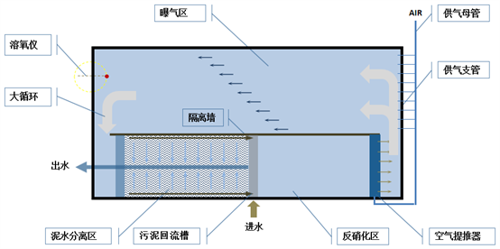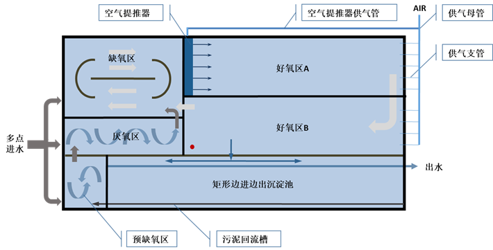 第Ⅰ代BioDopp工艺针对一般工业污水,将传统氧化沟的混合液内回流理念和CASS工艺的前置微生物选择区优点,配合空气提推技术,实现大比倍回流,控制溶解氧浓度在0.3mg/L左右,奠定工艺高效低耗的基础。