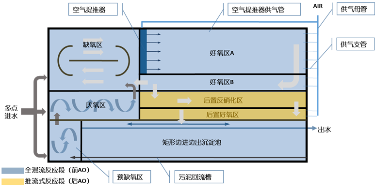 第Ⅲ代功能分区进一步明确,通过优化水力旋流与污泥回流路径,强化脱氮除磷。配合矩形边进边出沉淀池,避免了斜管斜板污堵的问题,并进一步降低造价和运行成本,出水可针对一级A及以上标准。