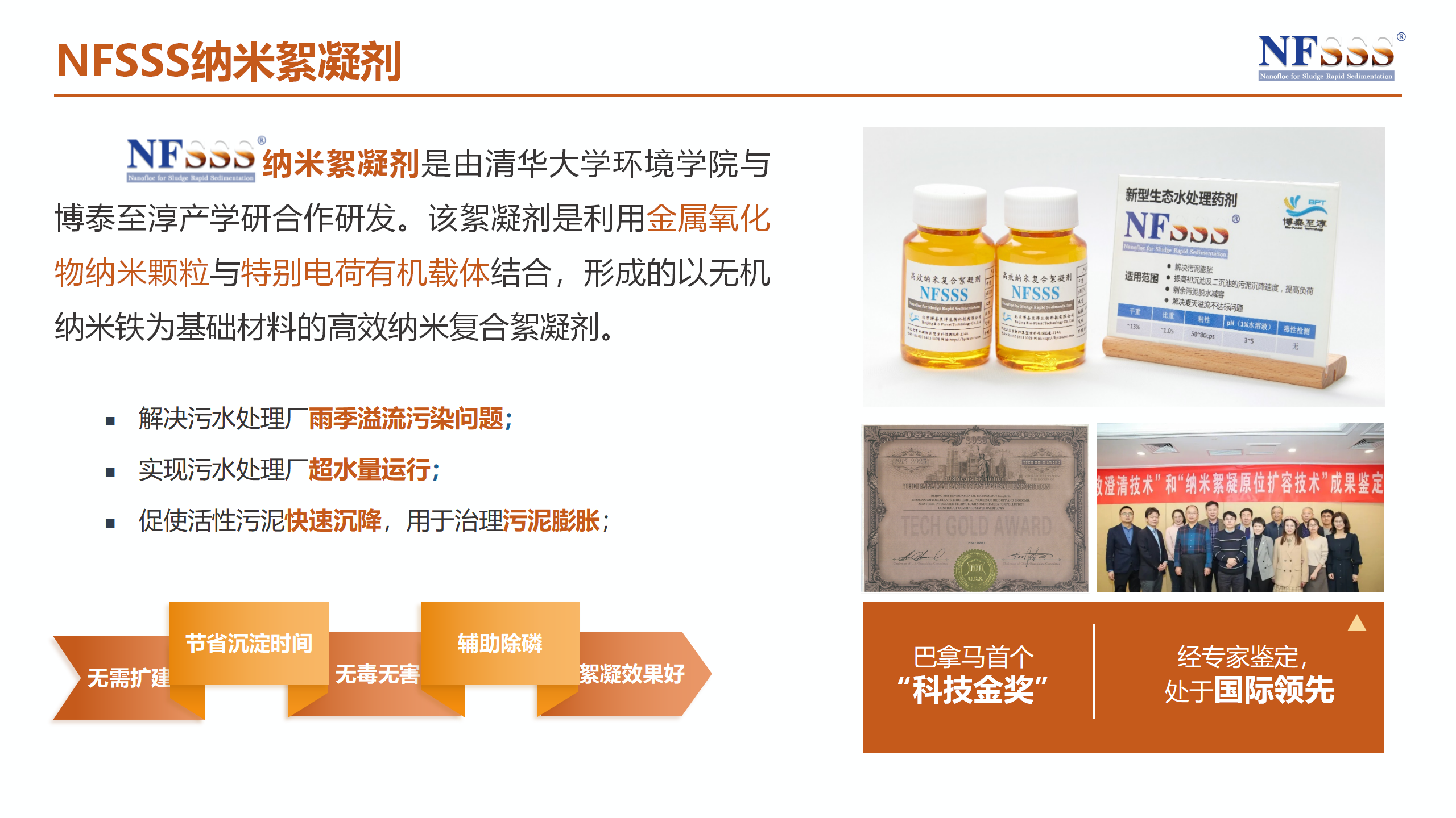 NFSSS(NanoFloc for Sludge Rapid Sedimentation)纳米絮凝原位扩能技术,是博泰至淳与清华大学环境学院针对污水处理厂雨季超负荷问题研发的创新解决方案。其核心在于: